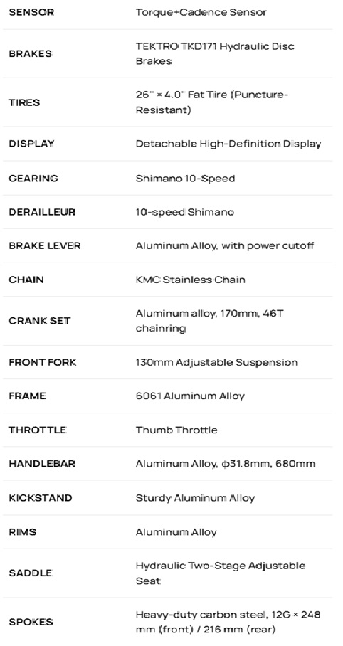 Key features: detachable HD-LED display with advanced functions, 10-speed Shimano gears, full (air) suspension, torque and cadence sensors, Tektro dual piston hydraulic brakes, power inverter-ready system, and more. Camo paint is a $100 upgrade.