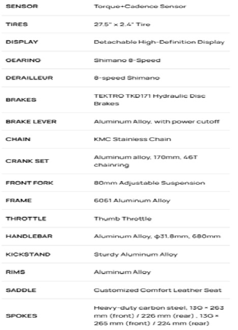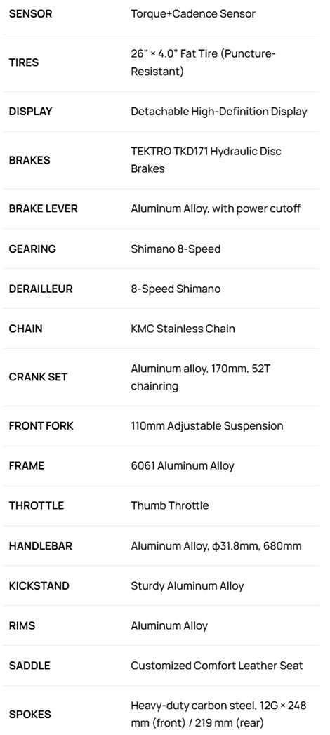 Key features: detachable HD-LED display with advanced functions, 8-speed Shimano gears, air suspension, Tektro dual piston hydraulic brakes, torque and cadence sensors, integrated rear rack, and more.